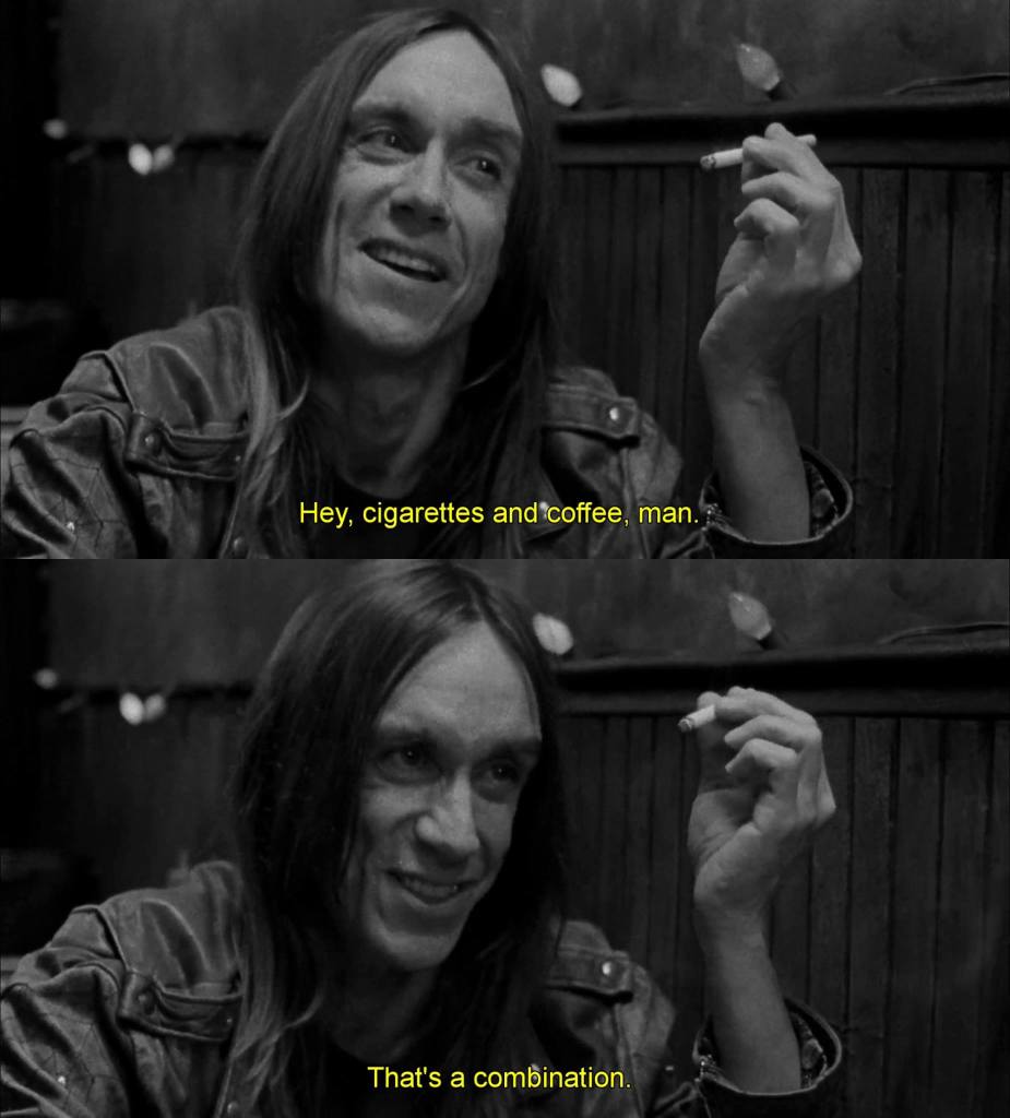 يتضمَّن عمل جارموش التاسع.. 11 جزءًا، في كل جزء يجلس شخصان -أحيانًا ثلاثة- يتناولون القهوة ويدخّنون السجائر، قد يتعرَّفون على بعضهم بالصدفة، أو قد يكونوا إخوة، أو يلتقون للمرة الأولى -والأخيرة!- أو أصدقاء، أو شخصٌ واحد يتطفَّل عليه آخر، أو صديقان أحدهما غير مدخِّن.. وما لفتَ انتباهي أنه ليسَ ثمَّة عُشّاق.. كأن الحب والعشق يسيء لقدسية طقوس تدخين السجائر وشرب القهوة أو ربما لأنّ “الحب كلّه” لهما فقط!) وتدور بينهم حوارات عفويّة أقرب للارتجال، بسيطة لن لا تخلو من عمق (بعضها يدور حولَ أضرار النيكوتين والكافيين/ ألفيس بريسلي ونظرية أخيه التوأم “الشرير”/ شرب القهوة قبلَ النوم لرؤية أحلام سريعة/باريس في العشرينات/نيويورك في السبعينات/ نيكولا تِسلا/ غوستاف مالِر.. وبعضٌ من الفلسفة.. وموضوعات لا معنى لها ولا جدوى من الخوض فيها).