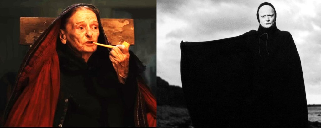 في شخصية هذه العجوز الأشبه بملك موتٍ خاصٍ بهذه الجزيرة المُتخيّلة المعزولة، ثمّة إحالة إلى شخصية الموت في فيلم الختم السابع (1957) لإنچمار بيرچمان، لكن عوضًا عن ممارسة البطل العائد من الحروب الصليبية، للعبة الشطرنج مع الموت نفسه من أجل البقاء، يلعب الموت نفسه الشطرنج بسكّان الجزيرة -الذين لا ليس بينهم أيّ بطل- وبأولئك الذين تدور بينهم رحى الحرب. والإحالة لا تستدعيها شخصيّةٌ واحدة فقط، بل أيضًا الموت المُشتَرَك القابع في الخلفية؛ ففي بانشيات إينشِرين، ثمّة نذيرُ شؤم بخاتمةٍ أو خواتم سيئة يلوح بالأفق بفعل الحرب وتبعاتها وإفرازاتها، وفي الختم السابع هناك نذيرٌ بخاتمة سيئة هي الموت بسبب الطاعون الأسود.